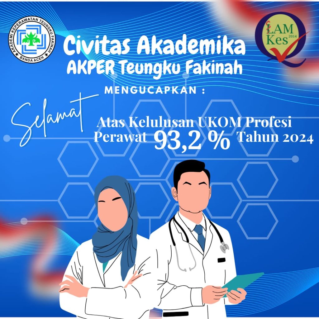 Mahasiswa D3 Akademi Keperawatan Teungku Fakinah Banda Aceh yang ikut serta dalam ujian kompetensi pada Periode 3 gelombang 1 Tahun 2024 sebanyak 44 orang diantaranya 42 orang First Taker dan 2 orang Retaker , berdasarkan hasil pengumuman kelulusan pada tanggal 26 Oktober 2024 sebanyak 41 orang (93.2%) lulus. Hasil ini menjadi pencapaian luar biasa yang menunjukkan kualitas pendidikan dan dedikasi dari seluruh civitas akademika Akper Teungku Fakinah, serta menjadi bukti kualifikasi lulusan pada program studi D3 Keperawatan. Hal ini merupakan suatu kebanggaan yang diperoleh tahun 2024 ini (link dokumen: https://drive.google.com/file/d/1j0OQtpYrdmJtsM41aEQvEBfATDlB4d11/view?usp=sharing
